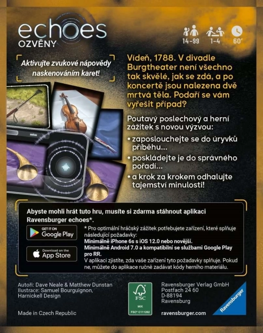 Scannen Sie einfach eine Karte in der kostenlosen Ravensburger echoes App und tauchen Sie ein in die vollständig auf Tschechisch vertonte Geschichte (Erzähler Václav Neužil). Das Spiel ist ideal für Familien und Freundeskreise und fördert Wahrnehmung, logisches Denken und Zusammenarbeit.