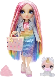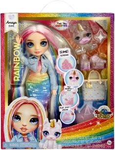 Die Puppe Rainbow High Amaya vereint modischen Look und endlose Spielmöglichkeiten. Lange Regenbogenhaare laden zum Kämmen und Stylen ein, das glitzernde Kleid und die Jeansjacke glänzen in jeder Vitrine, und die Gelenkkonstruktion ermöglicht dynamische Posen – von Catwalk-Posen bis zum Spagat.