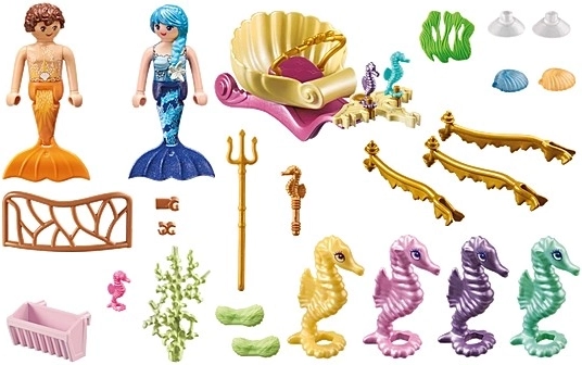 Begeben Sie sich in die Tiefen des Ozeans und lassen Sie Ihrer Fantasie freien Lauf. Dieses detailreich gestaltete Set bietet eine glitzernde Unterwasserkutsche, vier große Seepferdchen und zwei Figuren der Meeresfeen. Die Serie PLAYMOBIL Princess Magic fördert kreatives Spiel und das Erzählen eigener Geschichten für Kinder ab 4 Jahren.