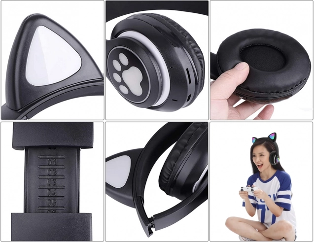 Stylische kabellose Kopfhörer mit Katzenohren und RGB‑LED‑BeleuchtungKomfort, klaren Sound und eine multifunktionale Ausstattung vereinen. Sie unterstützen Bluetooth 5.0, Wiedergabe von microSD, verfügen über FM‑Radio und ein integriertes Mikrofon für Freisprechanrufe. Weiche Ohrpolster und die leichte, faltbare Konstruktion sorgen auch bei längerem Hören für Bequemlichkeit.