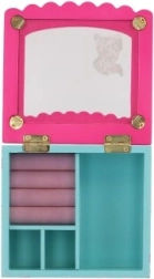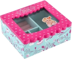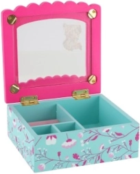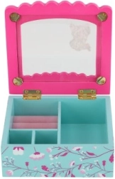 Stilvolles Holz-Schmuckkästchen für kleine Fashionistas und Erwachsene, das mit seiner türkis‑rosa Farbkombination, dem Blumenmuster und dem praktischen Spiegel im Deckel begeistert. Übersichtliche Fächer für Schmuck und Kleinigkeiten und dank der kompakten Maße passend für jeden Schminktisch oder das Kinderzimmer.