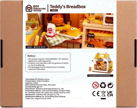 Die Bärenbäckerei ist eine bezaubernde Miniatur für alle, die Kreativität und Design lieben. Der Bausatz enthält alles Nötige für den Zusammenbau, inklusive Kleber und Werkzeugen – eine Schere genügt. Mit der LED-Beleuchtung verwandelt sich die Bäckerei in ein warmes, gemütliches Licht, das jedes Detail der Vitrinen, Schilder und Backwaren betont.