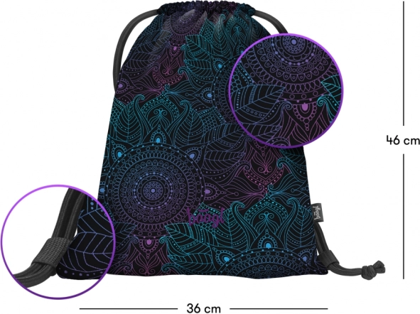 Der praktische und leichte BAAGL Zen Beutel besticht durch ein modernes Mandala-Design in Violett- und Türkistönen auf schwarzem Hintergrund. Er eignet sich für Schuhe, Sportausrüstung und Kleinigkeiten, die Sie immer griffbereit haben möchten. Dank des robusten und abwaschbaren Materials hält er dem täglichen Gebrauch mühelos stand.