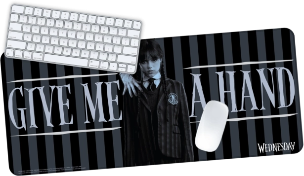 Stilvolles und funktionales Gaming-Pad inspiriert von der Figur Wednesday Addams. Die Maße 70 x 30 cm bieten ausreichend Platz für Maus und Tastatur und sorgen für ein optimales Spielerlebnis sowie Arbeitsumgebung.