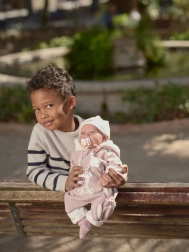 Ein Stoffkörper aus Baumwolle und Gliedmaßen aus Vinyl werden durch ein vierteiliges Outfit, ein Kissen und einen Schnuller ergänzt – alles bereit für sofortiges Spielen.