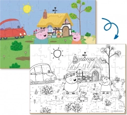 Dieses beidseitige Puzzle bietet Kindern doppelt so viel Spaß. Zuerst wird das fröhliche Motiv mit Figuren aus der beliebten Serie Peppa Wutz zusammengesetzt, anschließend kann die Rückseite nach dem Puzzeln nach eigener Fantasie ausgemalt werden.