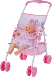 Der Kinderwagen ist leicht und einfach zu transportieren, mit rosa Rädern und einem Sitz voller Punkte und Herzchen. Ideal zum Spielen sowohl drinnen als auch draußen.