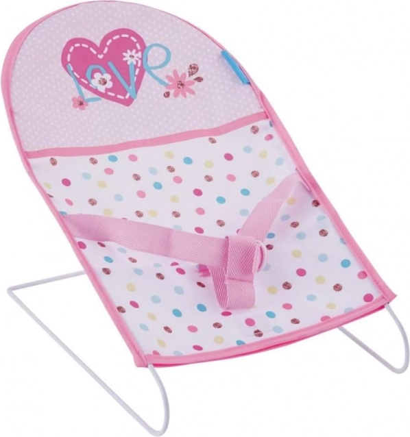 Der Schaukelsitz mit einem Metallrahmen bietet der spielenden Puppe einen bequemen Sitz. Er ist mit einem Sicherheitsgurt und einem Druck von Herzchen und Blumen ausgestattet.