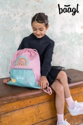 Praktischer Schulbeutel BAAGL für Schuhe und Freizeitaktivitäten im eleganten rosa Design „Regenbogen“. Bietet ein robustes, abwischbares Material, eine praktische Reißverschlusstasche im unteren Bereich und Zusammenziehen mit stabilen Kordeln, die ein bequemes Tragen auf dem Rücken ermöglichen. Dank des Karabiners lässt er sich leicht an der Schultasche befestigen.