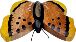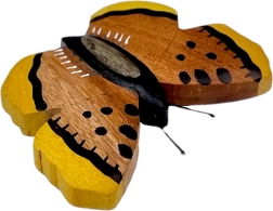 Bringen Sie ein Stück Natur nach Hause mit dem Holzmagneten in Schmetterlingsform. Jedes Stück ist handgefertigt und bemalt, wobei die Farbigkeit aus der Kombination von bis zu fünf Holzarten entsteht – von heller Gmelina über gelben Brotfruchtbaum bis hin zur dunkleren Kassie. Das Ergebnis ist eine authentische Optik mit feiner Holzmaserung.