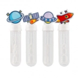 Jeder Seifenblasengenerator hat einen Deckel mit verschiedenen Weltraummotiven wie Planet, Satellit, UFO oder Rakete.