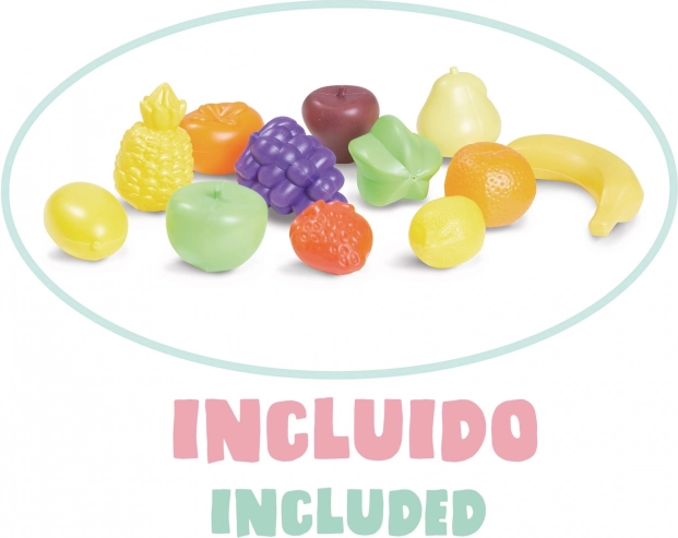 Enthalten sind 12 farbige Stücke Kunststoffobst, die das Kennenlernen von Lebensmitteln fördern und die Fantasie beim Kaufladen-Spiel anregen.