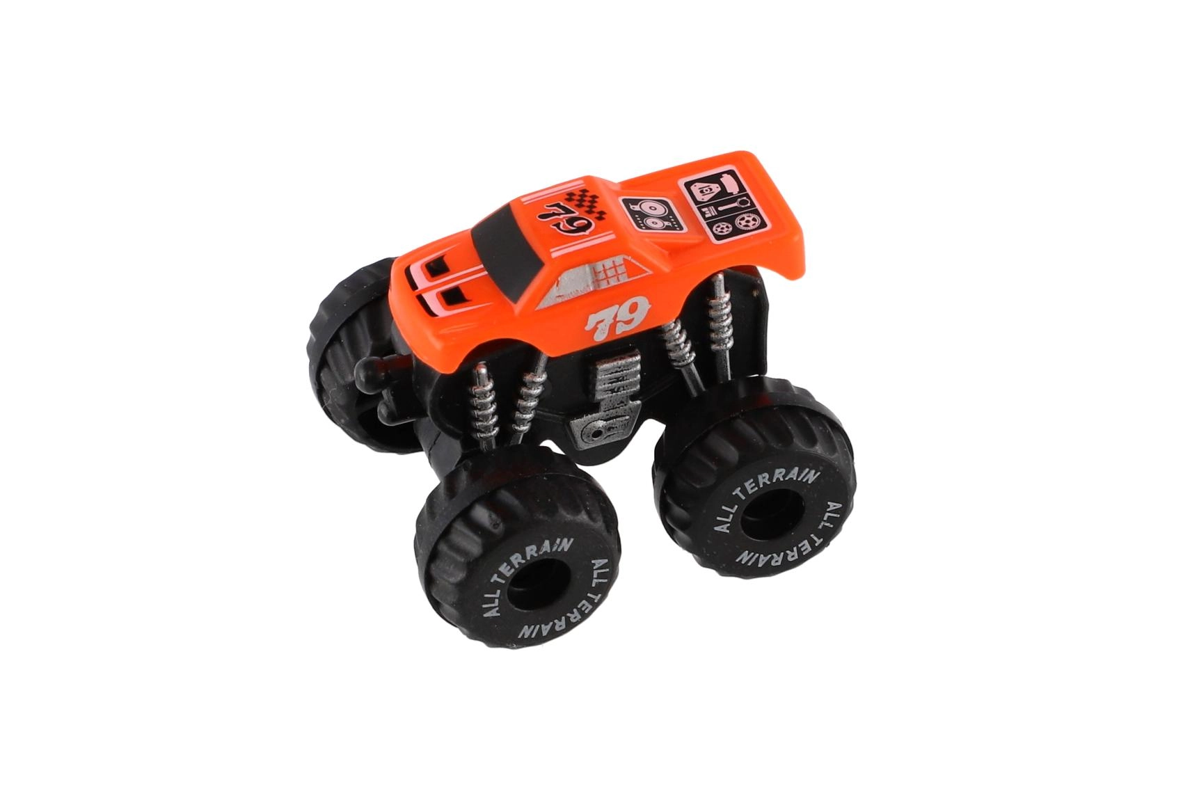 Das Auto ist in 3 Farben erhältlich (Orange, Blau, Rot) mit Renn-Details und Startnummern (z. B. 79, 65). Große Geländeräder mit grobem Profil und sichtbare Federdetails unterstreichen den Off‑Road‑Stil. Ideal zur Förderung der Feinmotorik, Koordination und für wettbewerbsorientiertes Spielen.