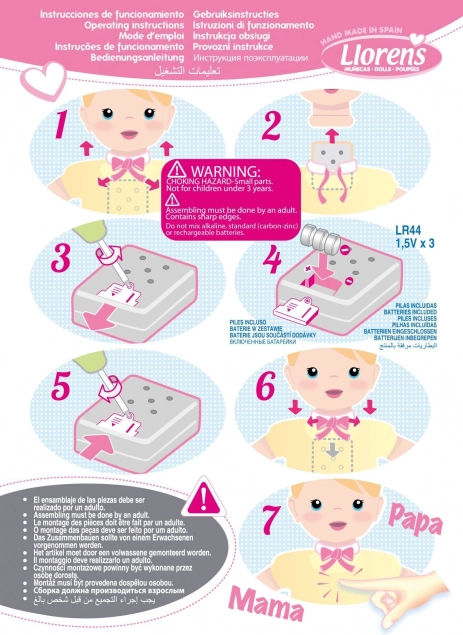 Das Produkt wird in Spanien handgefertigt und in einer schönen Geschenkverpackung geliefert. Es wird für Kinder ab 3 Jahren empfohlen und ist in Größe voll kompatibel mit weiterer originaler Kleidung der Marke Llorens. Die Puppe enthält 3x Knopfzellenbatterien LR44, die gemäß der beiliegenden Anleitung leicht ausgetauscht werden können.