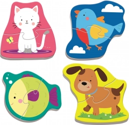 Entdecken Sie die ersten Puzzles für Kleinkinder – 4 niedliche Puzzles in Form von Haustieren. Jedes Bild besteht aus 2 großen Teilen, sodass Kinder schnell Erfolgserlebnisse haben und mit Freude immer wieder puzzeln. Satte Farben und freundliche Illustrationen laden ganz natürlich zum Spielen ein.