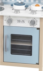 Zum Lieferumfang gehört umfangreiches Zubehör: Topf mit Deckel, Pfanne mit Ei, Löffel, Lochwender, Teigspatel sowie Salz- und Pfefferstreuer. Funktionale Details wie die beweglichen Uhrzeiger und die drehbaren Bedienknöpfe mit Klickgeräusch verleihen dem Spiel Realismus und vermitteln Kindern Grundprinzipien der Organisation beim Kochen und Backen.