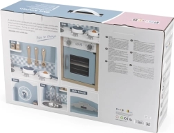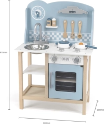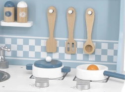 Die durchdachte Holzküche in polaren Farbtönen verbindet zeitloses Design mit hochwertiger Verarbeitung. Kinder finden darin alles, was sie aus einer echten Küche kennen – ein Spülbecken, einen Backofen, ein Kochfeld und eine Dunstabzugshaube – sowie zusätzlichen praktischen Stauraum mit Ablage für Lebensmittel und Geschirr. Die Oberfläche ist mit ungiftigen, sicheren Farben lackiert, und alle Kanten sind glatt für sicheres Spielen.