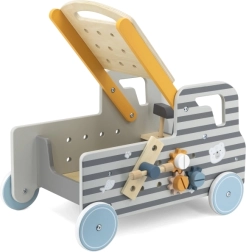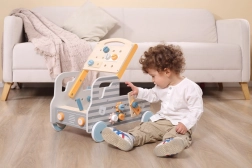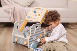 Diese rollbare Werkbank in Autoform kombiniert einen Arbeitstisch mit einem interaktiven Bauset. Alles besteht aus Holz und ist für kleine Hände angepasst, damit Kinder den Umgang mit Werkzeugen sicher ausprobieren können. Das Set weckt Neugier, fördert Geduld und unterstützt die Hand–Auge-Koordination.
