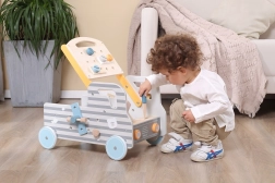 Ein Arbeitstisch mit Werkzeug, den Kinder ganz leicht mitnehmen können. Der Wagen mit Stauraum fördert Ordentlichkeit und unterstützt das selbstständige Spiel.