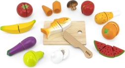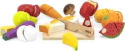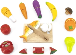 Dieses hochwertige Holzset enthält eine abwechslungsreiche Auswahl an Obst, Gemüse und weiteren Lebensmitteln – von Banane und Melone bis Karotte, Tomate oder Fisch. Kinder probieren das Schneiden mit dem Holzmesser auf dem Brett sicher aus und lernen, die einzelnen Lebensmittelarten, Farben und Formen zu erkennen. Ideal für das alleinige Spiel oder gemeinsames „Kochen“ mit den Eltern.