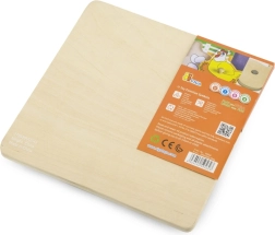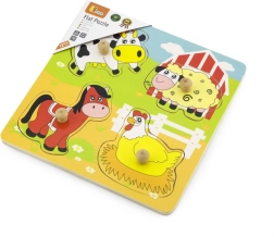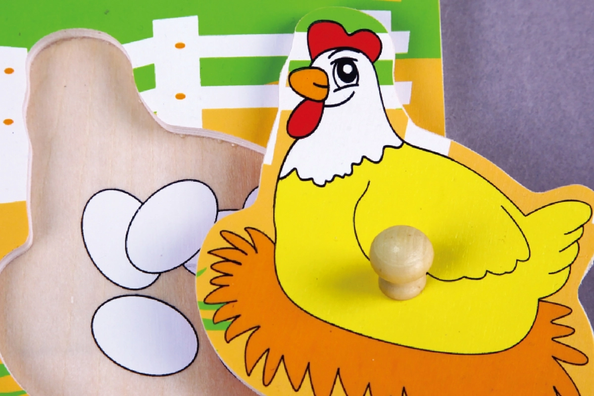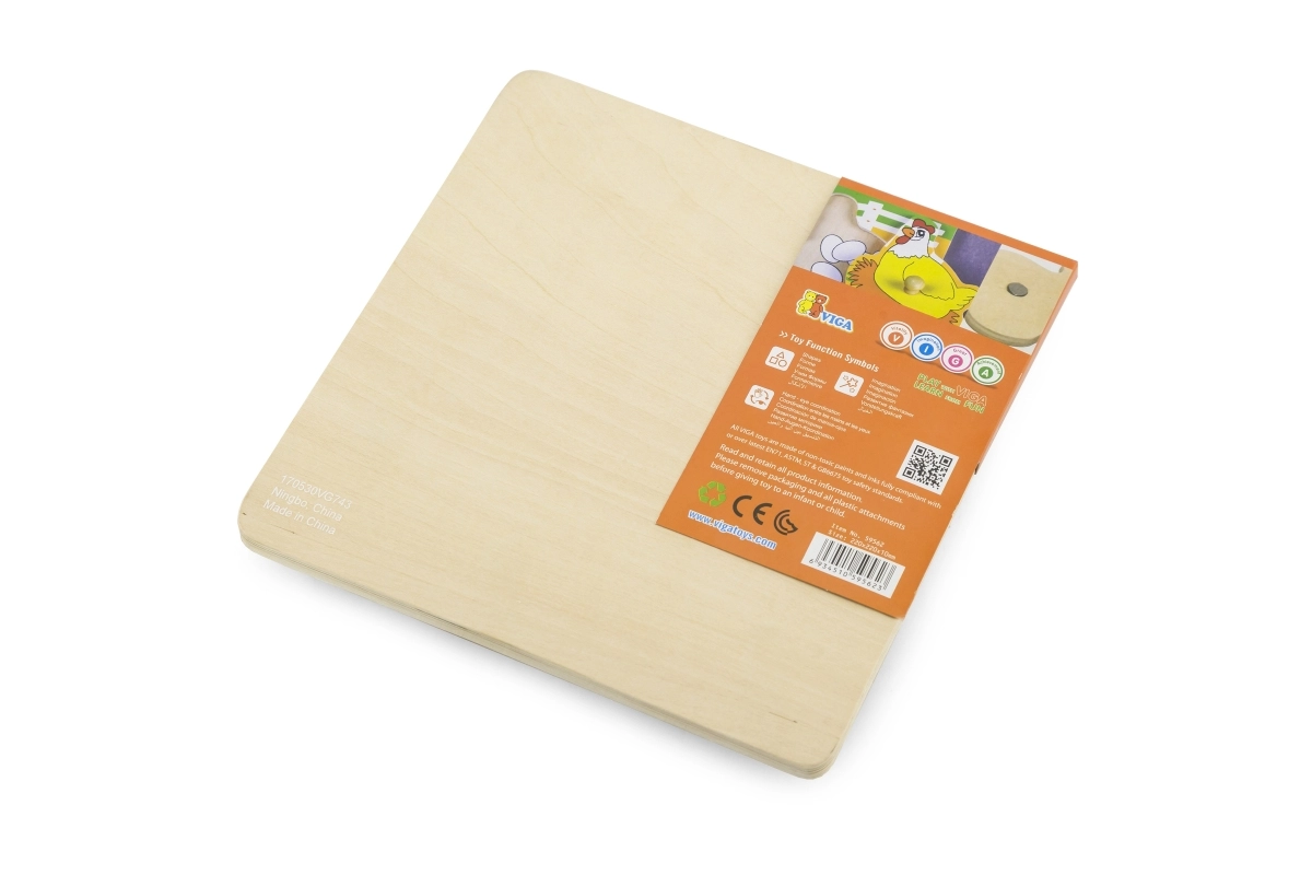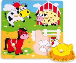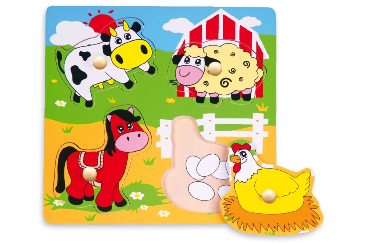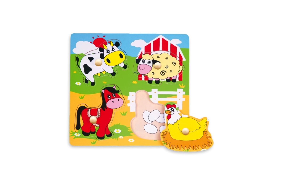Die robuste Holzplatte mit ungefähren Maßen von 22 × 22 cm ist reich mit einem Bauernhofmotiv illustriert, das zum Weiterspielen anregt und den Wortschatz erweitert (z. B. Kuh, Schaf, Pferd, Henne). Das Spielzeug ist ab 12 Monaten geeignet und lässt sich dank der kompakten Maße leicht verstauen und transportieren.