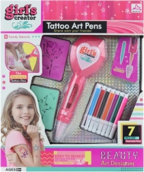 Erstelle schnell und einfach deine eigenen temporären Tattoos! Dieses kreative Tattoo-Set für Mädchen enthält 8 Schablonen, einen batteriebetriebenen Tattoo-Stift und 7 Farbstifte, sodass du fantasievolle, originelle Motive gestalten kannst. Stromversorgung: 2× AAA (nicht im Lieferumfang enthalten). Geeignet ab 5 Jahren.
