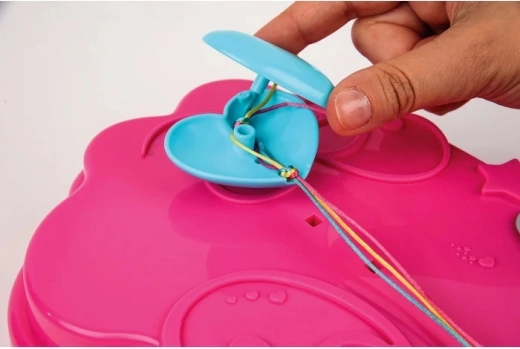 Der rosa Arbeitsrahmen mit Fächern hält Schnüre und Perlen übersichtlich an ihrem Platz, und die Rille hilft, die Fäden beim Flechten zu führen.
