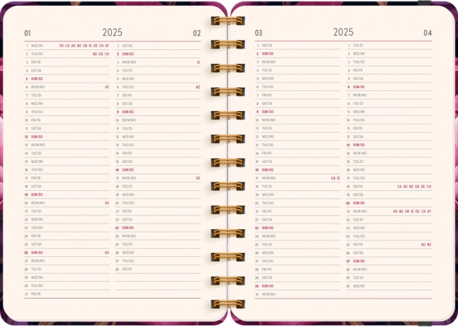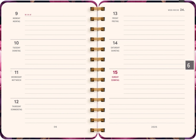 Dank der kompakten Maße von 13 × 18 cm passt der Planer leicht in Handtasche oder Rucksack, während die Spiralbindung ein bequemes flaches Aufschlagen und komfortables Schreiben ermöglicht. Jahresübersichten für 2024 und 2025 sowie markierte Feiertage erleichtern Orientierung und Planung.