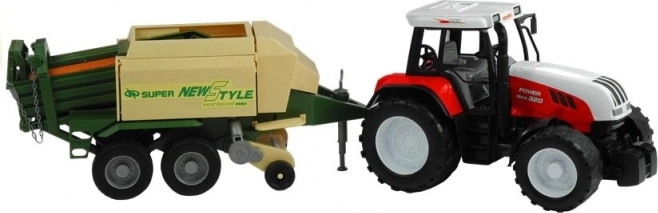 Der Anhänger umfasst bewegliche Teile wie eine ausziehbare Stütze, einen drehbaren Sammel- und Zuführmechanismus sowie seitliche und hintere Klappen zum Öffnen. Dieser spannende Traktor ist in roter und grüner Farbe erhältlich, was die Authentizität und den Spielspaß erhöht.