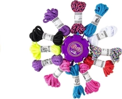 Das Set enthält 12 Schnüre in verschiedenen Farben, mit denen Sie nach Ihrer Fantasie farbenfrohe Armbänder herstellen können.