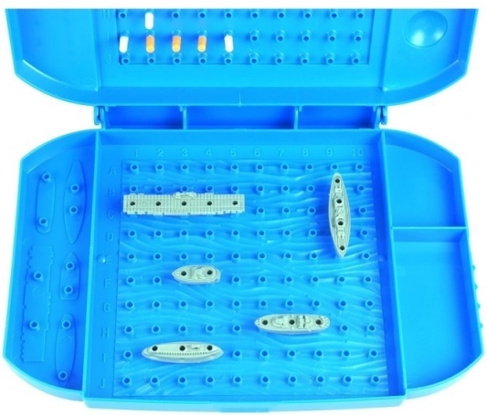 Zu Beginn des Spiels setzt ihr euch einander gegenüber und klappt eure Koffer so auf, dass der Gegner nicht sehen kann, welche Anordnung gewählt wurde. Jeder Spieler nimmt fünf Schiffe – einen Zerstörer, zwei U-Boote, ein Schlachtschiff und einen Flugzeugträger – und platziert sie in einer gewählten Formation auf dem Ozeanbrett im Kofferboden. Die Schiffe können vertikal oder horizontal, jedoch nicht diagonal platziert werden. Sobald das Spiel beginnt, dürfen die Positionen der eigenen Schiffe nicht mehr verändert werden.