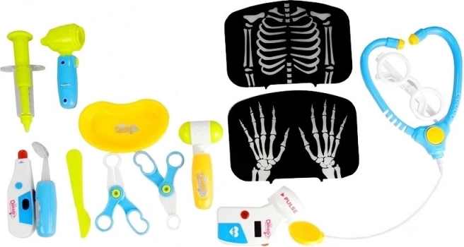 Enthalten ist eine bunte Auswahl an Zubehör: Stethoskop, Schere, Skalpell, Reflexhammer, Pulsmesser, Brille, Ärztetafel, Röntgenaufnahmen von Kopf, Brustkorb und Händen, Schachteln „mit Medizin“ und weiteres Kleinzubehör. Das Set ist ideal für die Förderung der Feinmotorik, soziales Spielen und kreative Vorstellungskraft.