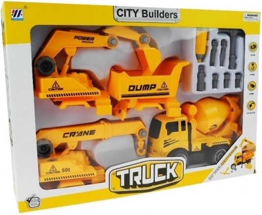 Unterhaltsames Set von Baufahrzeugen für kleine Tüftler, das manuelle Fähigkeiten und logisches Denken fördert. Enthält Betonmischer, Kipper, Kran und Bagger.