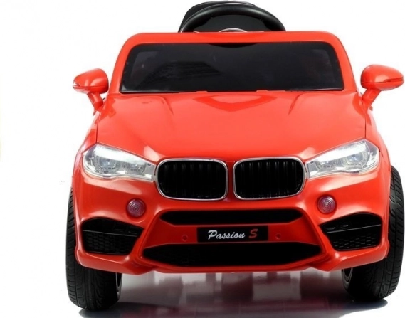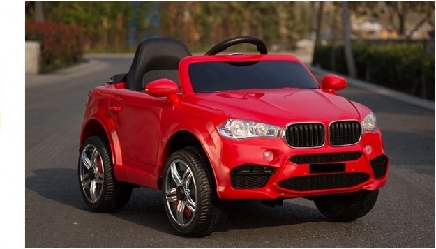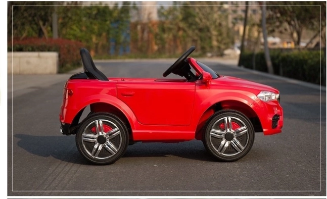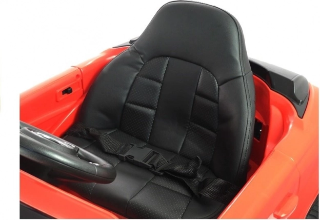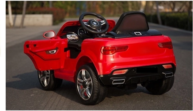 Das rote elektrische Auto ist sorgfältig gestaltet, um wie ein echter Luxuswagen auszusehen, mit Details wie Lichtern und öffnenden Türen.
