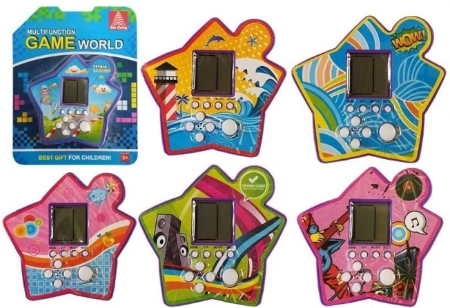 Das elektronische Spiel in Sternform ist sehr leicht und dank seiner kompakten Größe können Sie es leicht mitnehmen. Es enthält ein Display und weiße Tasten für Spielfunktionen wie Start, Pause, Stummschaltung oder Reset.