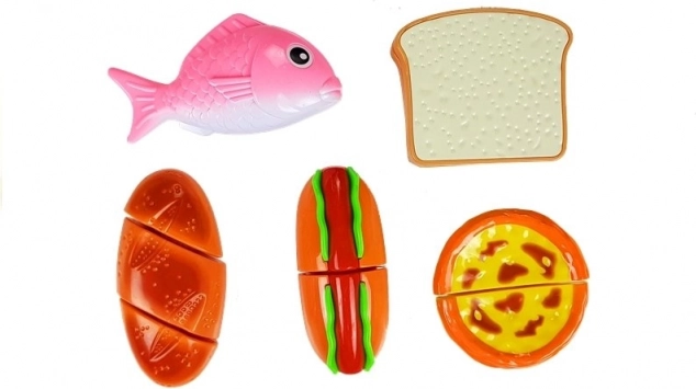 Entdecken Sie die spaßige Welt des Kochens mit dem Kinderset aus Lebensmitteln, bei dem jedes Teil mit Klett verbunden ist. Kinder können einen Hotdog zubereiten, Fisch servieren, Backwaren schneiden oder einen Cupcake „backen“. Das sichere Kunststoffmesser und das Brettchen ermöglichen ein realistisches, aber völlig ungefährliches Schneiden.