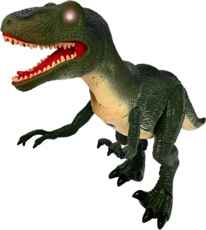 Eingebaute Lichteffekte lassen die Augen des Raptors aufleuchten und betonen seinen Ausdruck – Kinder tauchen sofort in die prähistorische Atmosphäre ein.