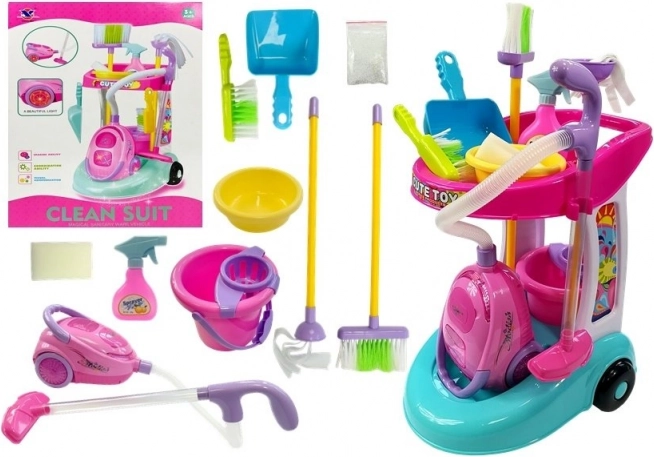 Das Set enthält eine bunte Palette von Putzwerkzeugen im Kindermaßstab, wie Staubsauger, Wischmopp, Besen, Kehrschaufel und Eimer.