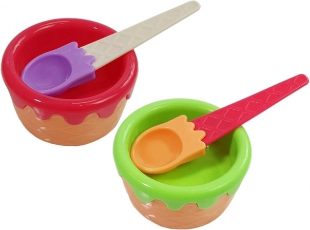 Bunte Waffeln, Schälchen und ein Portionierer ermöglichen das Mischen von Geschmacksrichtungen und das Kreieren von Eiskombinationen nach Lust und Laune.