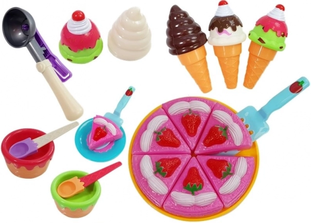 Verwandeln Sie das Kinderzimmer in eine gemütliche Konditorei. Dieses umfangreiche Dessert-Set bietet alles, was Kinder zum Servieren von Torten und Eis benötigen: Torte mit 6 Stücken, Waffeln, Schälchen, Teller sowie einen Tortenheber. Die bunten Farben laden zum Entdecken, Sortieren und Kombinieren ein und fördern so Kreativität und Rollenspiele.