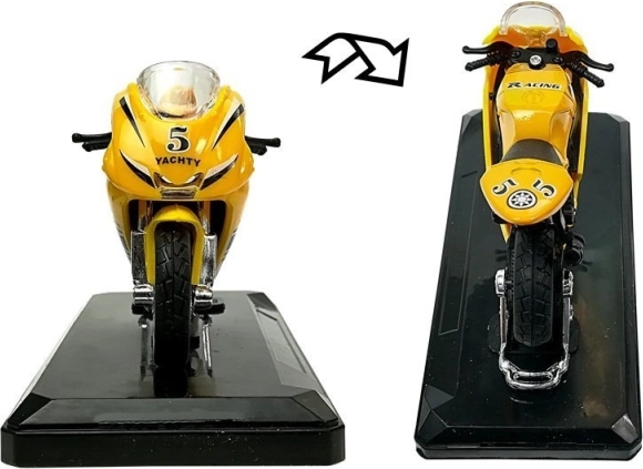 Das Modell begeistert mit Funktionen: Beim Drücken des hinteren Teils ertönen Sound-Signale, es verfügt über beweglichen Lenker und dank Schwungrad fährt es nach vorne – einfach nach hinten ziehen. Enthalten ist ein abnehmbarer Ständer/Sockel für sicheres Ausstellen.