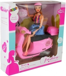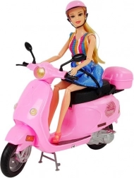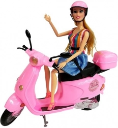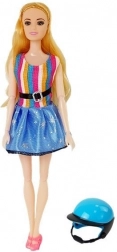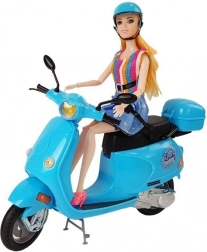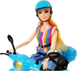 Die Puppe im Set hat lange, blonde Haare, die gekämmt und gestylt werden können. Sie ist in stilvollen Kleidern mit blauen und bunten Streifen gekleidet, was ihr ein elegantes Aussehen verleiht. Bewegliche Arme und Beine ermöglichen es, die Puppe leicht auf dem Roller zu befestigen, sodass Kinder ihre eigenen Szenarien und Geschichten erstellen können.
