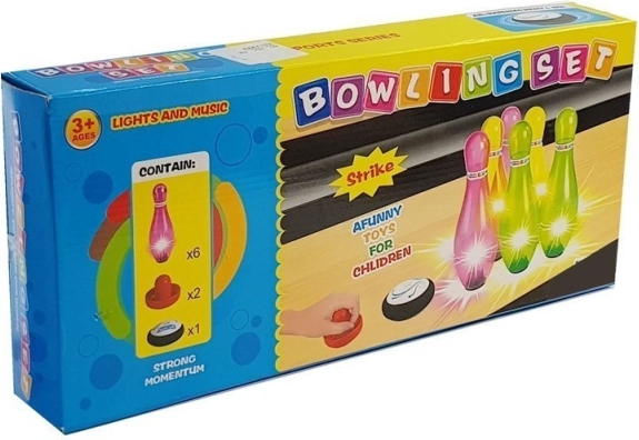 Farbiger Bowling-Set mit sechs Kegeln und Lichteffekten ist idealer Spaß für Kinder und Erwachsene. Hilft, Präzision und Koordination zu entwickeln.