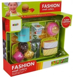 Das Set umfasst eine bunte Auswahl an Zubehör – vom Tablett über Teller bis hin zu verschiedenen, realistisch aussehenden Desserts, die Kindern die Freude am „Kochen“ erleben lassen.