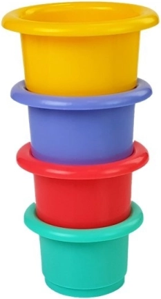 Das Set enthält vier verschiedene bunte Eimer mit Löchern, um den Wasserfluss zu beobachten.