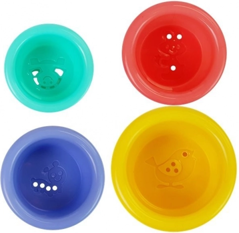 Teil des Sets sind 4 farblich unterscheidbare Eimer, die stapelbar sind. Auf ihren Böden befinden sich verschieden weit entfernte Löcher, durch die unterschiedliche Wasserströme beobachtet werden können. Jeder Eimer ist mit eingravierten Tierformen verziert, wie zum Beispiel Vogel, Wurm, Kaninchen und Schildkröte. Dieses Spielzeug ist nicht nur spaßig, sondern hilft den Kindern auch, Farben zu erkennen und ihre motorischen Fähigkeiten zu entwickeln.