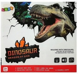 Der Dinosaurier bewegt sich selbstständig vorwärts, dreht den Kopf, öffnet das Maul und brüllt wie ein echtes Raubtier. Das farbige Unterleuchten der Schuppen am Kopf verleiht jeder Szene zusätzliche Spannung.