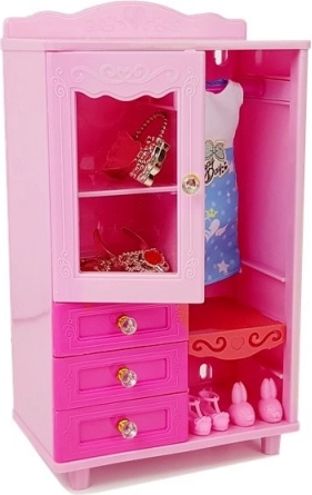 Ein praktischer Schrank mit Regalen und Schubladen hilft Kindern, Puppenkleidung, Schuhe und Accessoires zu sortieren.