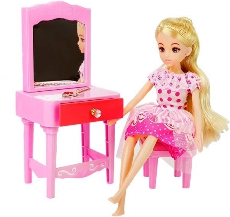 Der rosafarbene Schminktisch mit Spiegel und Hocker ermöglicht das Stylen von Frisuren und die Vorbereitung der Puppe für den Tag.