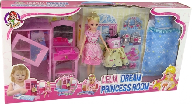 Puppe mit Schlafzimmer – Bett, Kleiderschrank und Schminktisch